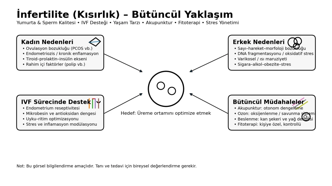 Kısırlık (infertilite), bir yıl boyunca düzenli ve korunmasız ilişkiye rağmen gebelik elde edilememesi olarak tanımlanır. Günümüzde infertilite yalnızca üreme organlarının lokal bir problemi değil; hormonal denge, bağışıklık sistemi, metabolizma, stres yanıtı, çevresel toksinler ve yaşam tarzı ile yakından ilişkili çok faktörlü bir süreç olarak ele alınmaktadır. Bu nedenle modern üreme tıbbının yanında bütüncül (holistik) yaklaşımlar, hem doğal yolla gebelik şansını artırmak hem de IVF (tüp bebek) gibi yardımcı üreme tekniklerinin başarısını desteklemek amacıyla giderek daha fazla gündeme gelmektedir.